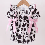 Adorable black cow-print bubble with charming bow and ruffled details! This playful piece features a classic Holstein pattern that's absolutely moo-velous. Perfect for little ones who love cute animal designs, the soft bubble silhouette offers comfort and style. The sweet bow accent and delicate ruffles add extra personality to this fun wardrobe essential. Ideal for playdates, casual outings, or just spreading smiles wherever you go!