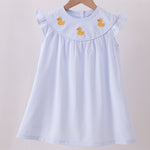 Dive into whimsy with this charming blue dress, where adorable duck embroidery meets cheerful stripes for a look that's equal parts sweet and spirited. Delicate ruffles dance along the edges, adding a playful flutter to every twirl and movement. Perfect for little ones who love standing out with personality and style, this dress combines comfort with character. Whether it's playdates, family gatherings, or everyday adventures, this delightful piece brings joy and imagination to any wardrobe.
