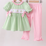 Green clover embroidery stripe bow pants set - 12 Months is backordered and will ship as soon as it is back in stock.