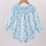 Celebrate the season in style with this Blue Snowman Christmas Tree Smocked Bubble. Featuring charming smocked detailing and a whimsical snowman design, this playful piece adds festive cheer to any outfit. Its cozy fabric ensures comfort, making it perfect for holiday gatherings and joyful moments.