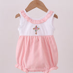 Pink cross jacquard embroidery ruffle bubble - 3 Months is backordered and will ship as soon as it is back in stock.