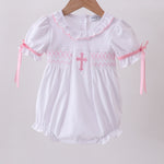 White cross smocked ruffle bubble - 3 Months is backordered and will ship as soon as it is back in stock.