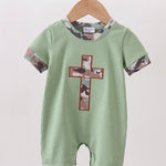 Green camoflage cross applique romper - 3 Months is backordered and will ship as soon as it is back in stock.