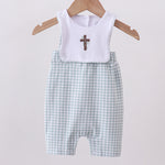 Charming gingham jon jon featuring delicate blue cross embroidery detailing. This classic two-piece set combines traditional craftsmanship with timeless style, perfect for special occasions or everyday wear. The soft gingham pattern pairs beautifully with intricate embroidered accents, creating an elegant look that celebrates heirloom-quality design. Ideal for adding a touch of sophistication to any child's wardrobe.