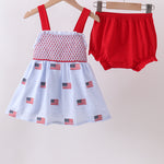 Blue flag embroidery seersucker bloomer set - 12 Months is backordered and will ship as soon as it is back in stock.