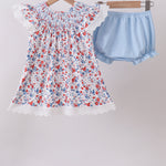 Blue floral lace smocked bloomer set - 12 Months is backordered and will ship as soon as it is back in stock.