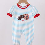 Blue stripe sports trio applique romper - 3 Months is backordered and will ship as soon as it is back in stock.