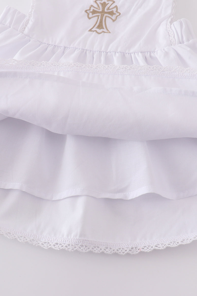 Premium cross embroidery romper - 6 Months is backordered and will ship as soon as it is back in stock.