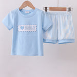 Blue I love MAMA smocked shorts set - 3 Years is backordered and will ship as soon as it is back in stock.