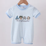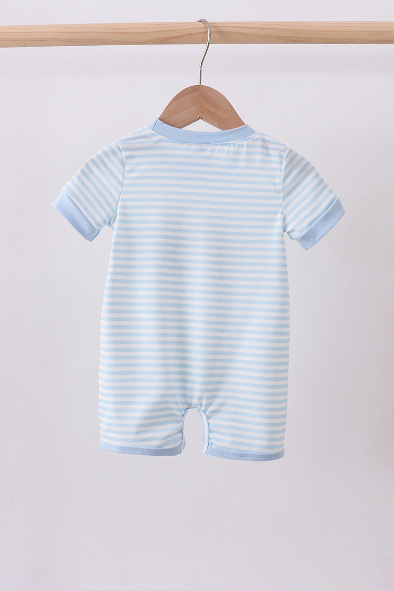 Blue this is my happy place embroidery stripe romper - 6 Months is backordered and will ship as soon as it is back in stock.