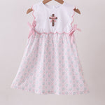 Pink cross embroidery floral bow dress