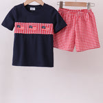 Red flag smocked gingham shorts set