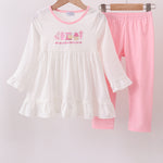 Get ready for fun and comfort with the "Bake me a cake as fast as you can" embroidery ruffle pants set. Featuring playful embroidery and charming ruffle details, this set adds a dash of whimsy to everyday wear. Soft, breathable fabric ensures all-day ease, making it perfect for playful moments or cozy days at home. Celebrate style and comfort in one delightful outfit!