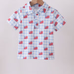 Blue flag print button down shirt - 12 Months is backordered and will ship as soon as it is back in stock.