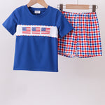 Blue flag smocked gingham shorts set