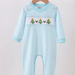 Blue stripe christmas tree smocked romper - Newborn is backordered and will ship as soon as it is back in stock.