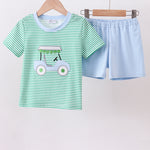 Get ready to tee off in style with this playful shorts set featuring a charming golf cart applique and vibrant green stripes. Perfect for golf enthusiasts and casual comfort seekers alike, this set combines fun clover details with a sporty aesthetic. The lightweight design keeps you cool on the course or around town, while the coordinated pieces make getting dressed effortless. Whether you're hitting the links or just channeling that golf-inspired vibe, this set brings personality and comfort together in one delightful package.