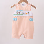 Charming orange striped seersucker jonjon featuring delicate animal smocking details. This lightweight, breathable fabric is perfect for warm weather wear, offering classic style with playful embroidered accents. The seersucker texture adds texture and visual interest, while the smocked design provides comfortable, flexible fit. Ideal for children's clothing or casual summer outfits.