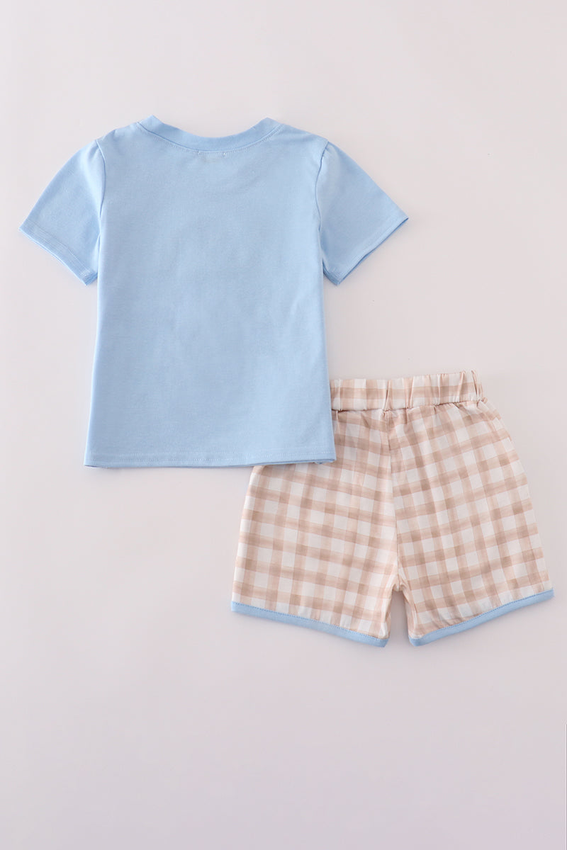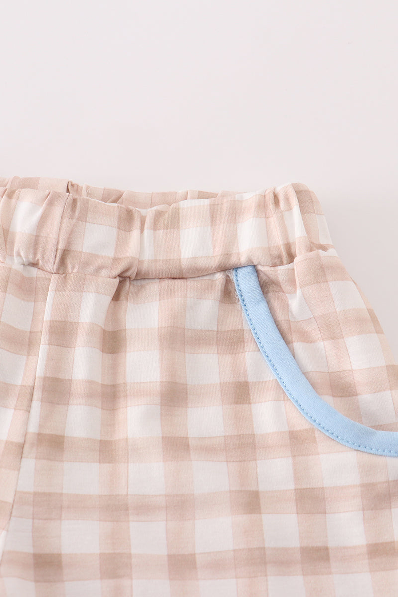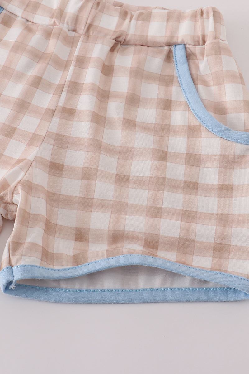 Beige puppy embroidery gingham shorts set