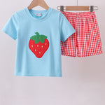 Adorable gingham shorts set featuring a charming blue strawberry applique design. Perfect for little ones who love fun, fruity fashion! The classic gingham pattern pairs beautifully with the whimsical strawberry detail, making this set ideal for playdates, casual outings, or summer adventures. Comfortable and cute, it's a wardrobe essential that brings personality and style to any child's collection.