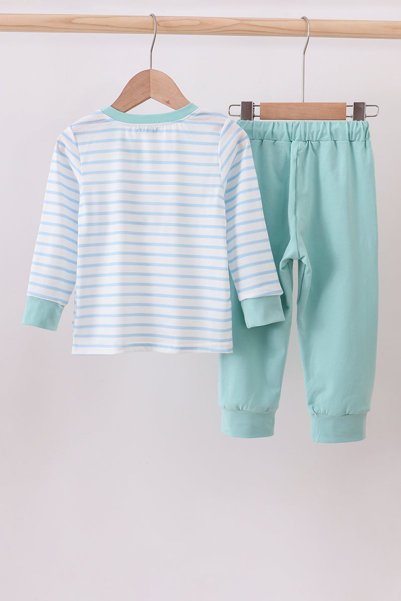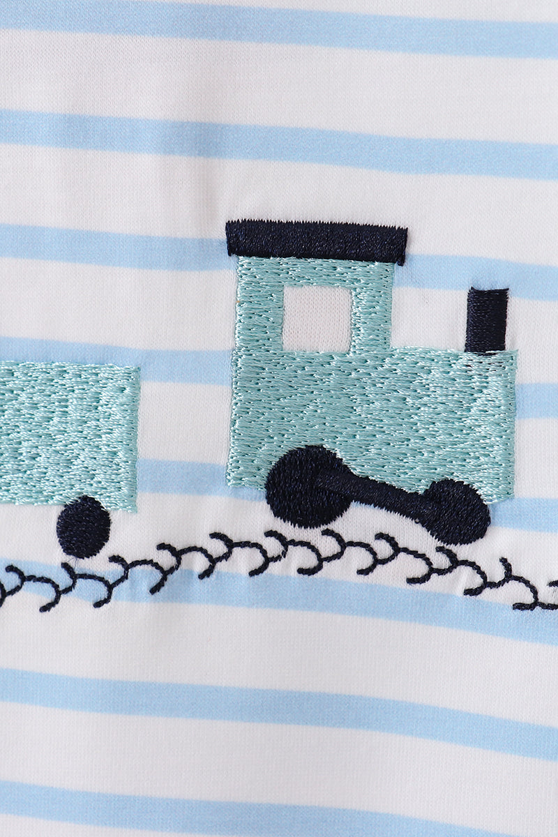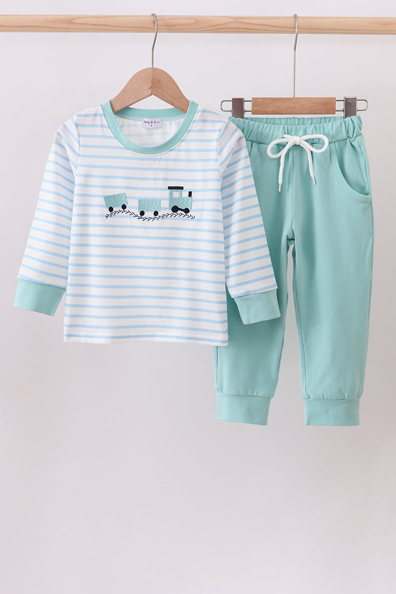 Green three trains embroidery stripe boy pants set - 6 Years is backordered and will ship as soon as it is back in stock.