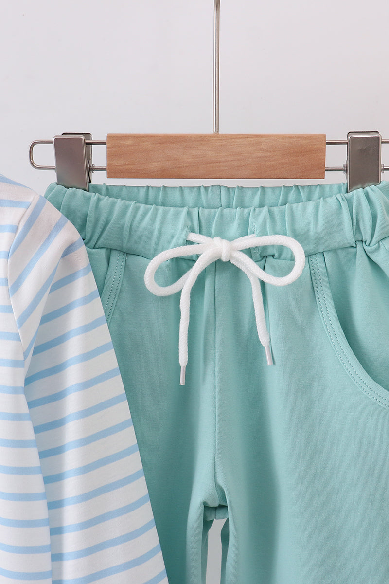 Add a fun twist to your little one’s wardrobe with this green pants set featuring three charming embroidered trains and bold stripe accents. Designed for comfort and play, these pants let your boy explore with ease while looking delightfully stylish. Perfect for everyday adventures and playful moments!
