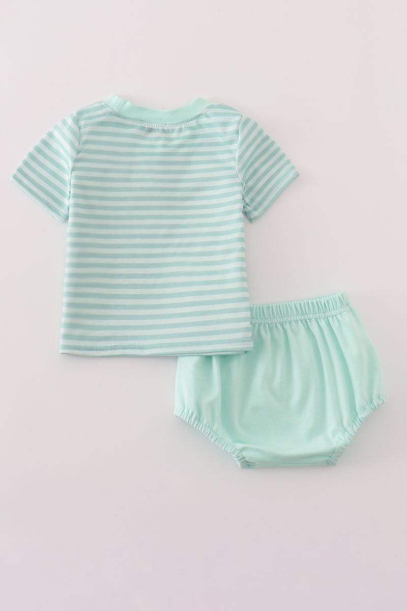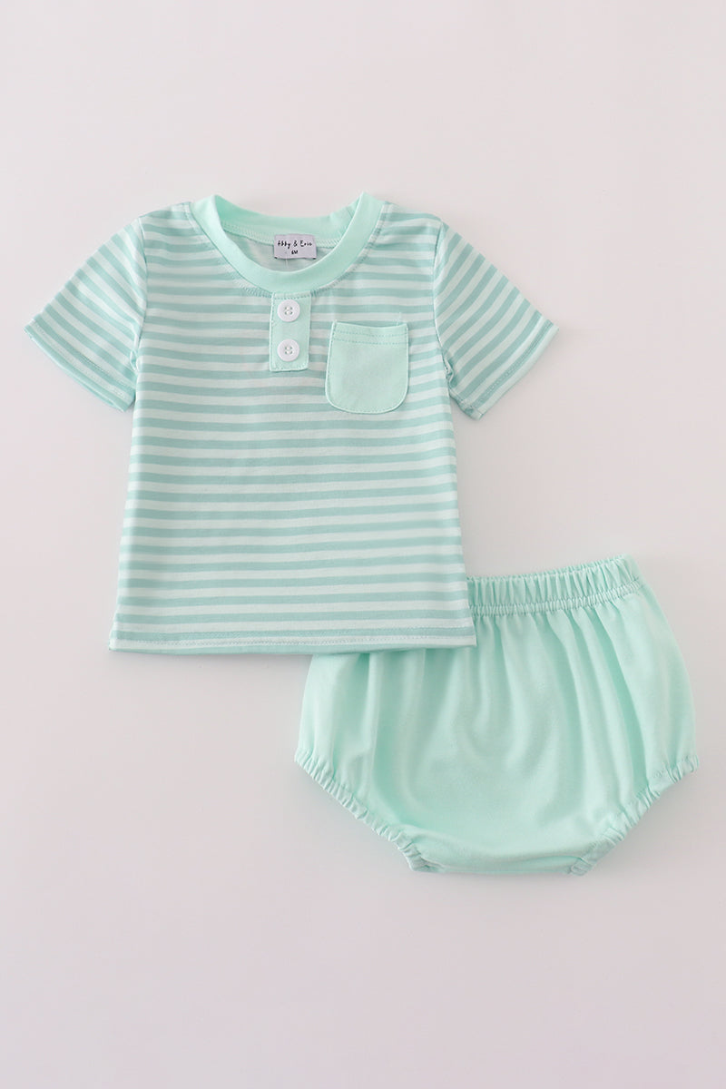 Dress your little one in our adorable Mint stripe bloomer set! These playful bottoms feature a cheerful mint stripe pattern that's perfect for mixing and matching. Soft, breathable fabric keeps tiny tushies comfy all day long, while the elastic waistband makes diaper changes a breeze. An essential addition to any baby's wardrobe!