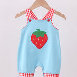 Blue strawberry applique bubble - 3 Months is backordered and will ship as soon as it is back in stock.