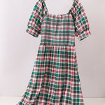 Green plaid smocked mom dress