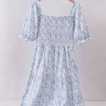 Twirl into spring in this charming navy dress that's equal parts sweet and sophisticated. Delicate floral details dance across the bodice, while romantic puff sleeves add a touch of whimsy to your everyday look. The smocked waist creates a flattering silhouette that moves with you, whether you're heading to brunch or a garden party. Perfect for anyone who loves feminine style with a playful edge.