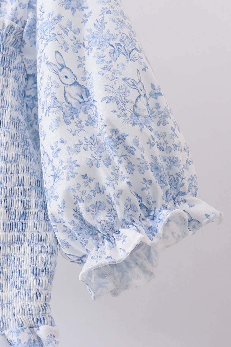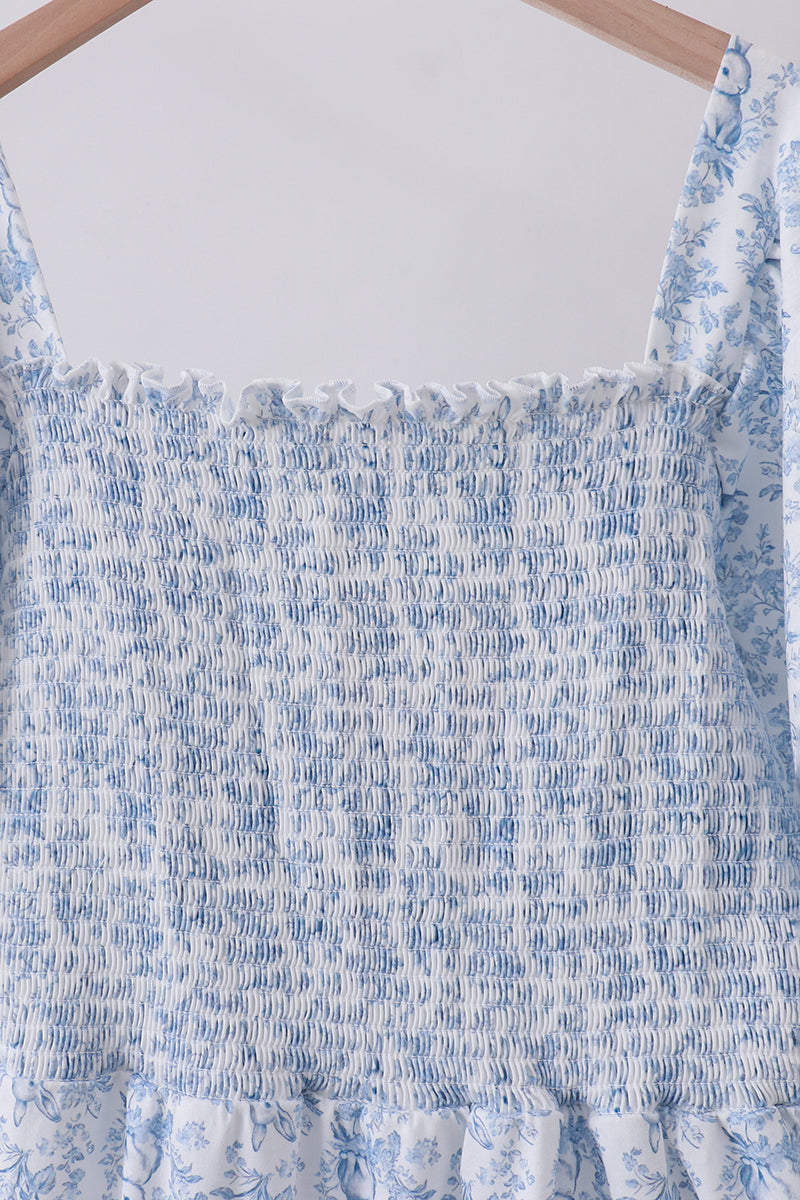 Navy smocked floral puff sleeve dress - S is backordered and will ship as soon as it is back in stock.