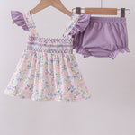Twirl into springtime style with this adorable purple floral bloomer set! Featuring delicate smocked detailing and charming ruffled edges, it's the perfect blend of comfort and cuteness. The soft, breathable fabric keeps little ones cool while the elastic waistband ensures a snug fit for all-day play. Whether it's a garden party or casual weekend adventures, this sweet set brings effortless charm to any wardrobe.