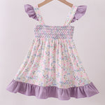 Purple floral smocked ruffle dress - 12 Months is backordered and will ship as soon as it is back in stock.