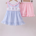 Dive into coastal charm with this delightful shorts set featuring playful blue crab embroidery on classic seersucker fabric. The textured weave offers breathable comfort perfect for warm weather, while charming ruffles add a touch of whimsy to the design. Ideal for beach days, casual outings, or relaxed summer gatherings, this set captures a nautical spirit with timeless appeal. A fun and comfortable choice for those who love ocean-inspired style.