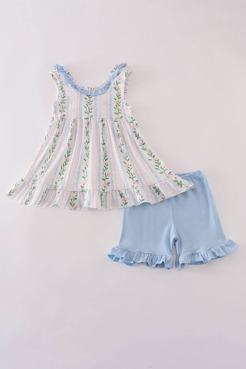 Blue floral print ruffle shorts set - 2 is backordered and will ship as soon as it is back in stock.