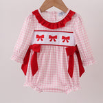 Pink bow embroidery gingham ruffle bubble - 3 Months is backordered and will ship as soon as it is back in stock.