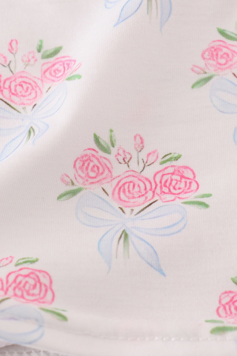 Blue floral bow print ruffle bloomer set - 12 Months is backordered and will ship as soon as it is back in stock.