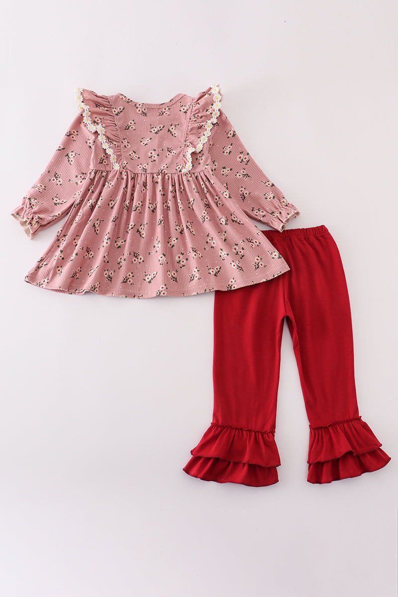 Floral corduroy lace ruffle pants set - 7 Years is backordered and will ship as soon as it is back in stock.
