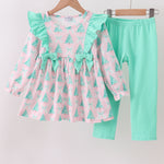 Pink christmas tree ruffle pants set - 2 Years is backordered and will ship as soon as it is back in stock.