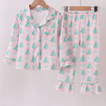 Cozy up this holiday season in our Pink Christmas Tree Ruffle Pajama Set! Featuring a charming pink hue and playful Christmas tree prints, this set adds festive fun to your bedtime routine. The delicate ruffle details bring a touch of whimsy, making these pajamas perfect for holiday lounging or festive sleepovers. Soft, comfortable, and full of cheer, they’re sure to make your nights merry and bright.