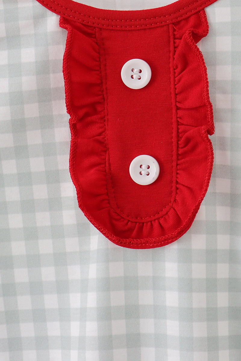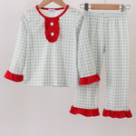 Slip into cozy charm with the Sage gingham ruffle pajama set. Featuring a delightful gingham pattern and playful ruffle details, this set brings a touch of whimsy to your bedtime routine. Soft and breathable fabric ensures comfort all night long, making it perfect for lounging or dreaming sweetly. Embrace relaxation with style and a smile in this adorable pajama set.