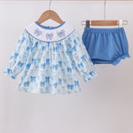 Blue bow smocked bloomer set - 12 Months is backordered and will ship as soon as it is back in stock.