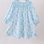 Get festive in style with this playful blue dress featuring charming snowman and Christmas tree smocked details. Perfect for holiday celebrations, its soft fabric ensures comfort while the delightful pattern adds a touch of whimsy to your child’s outfit. Ideal for spreading joyful cheer at any seasonal gathering!