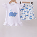 Blue whale applique ruffle shorts set