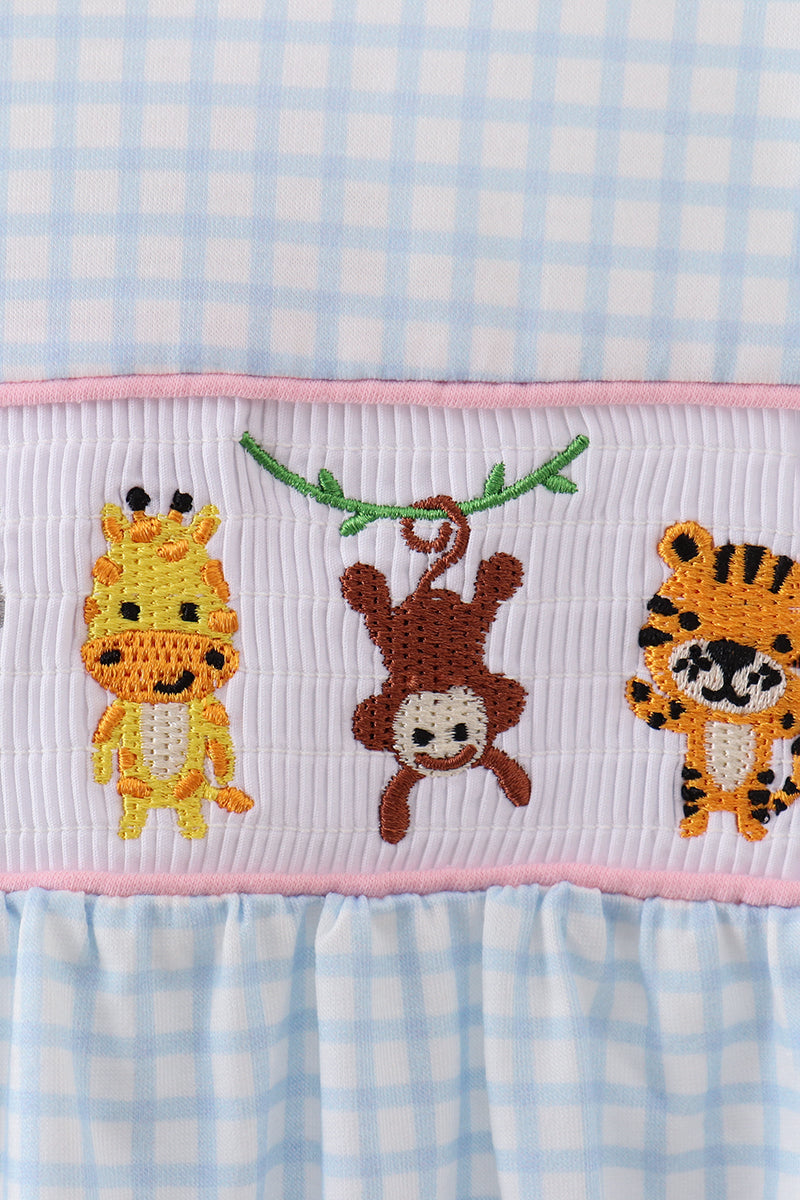 Blue animal smocked ruffle romper - 9 Months is backordered and will ship as soon as it is back in stock.