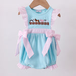Adorable blue seersucker bubble featuring charming farm animal embroidery details and playful ruffled accents. The lightweight, textured fabric offers comfort and breathability, perfect for warm weather wear. Delightful design captures a whimsical countryside aesthetic with quality craftsmanship. Ideal for little ones who love animals and classic, cheerful style.