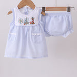 Adorable blue seersucker bloomer set featuring a charming sailboat print. Crafted from lightweight, breathable seersucker fabric perfect for warm weather play. The classic bloomer silhouette offers comfortable coverage with an elastic waistband and leg openings. Ideal for beach days, summer outings, or everyday wear. Soft, durable construction designed to withstand active play and frequent washing.