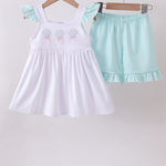 Dive into coastal charm with this enchanting blue seashell embroidery ruffle shorts set. Delicate seashell details are beautifully embroidered across soft fabric, while playful ruffles add a whimsical touch to the shorts. Perfect for beach days, summer outings, or anyone who loves ocean-inspired style. The comfortable fit and quality construction make it an ideal choice for warm-weather adventures. Embrace your inner mermaid with this adorable two-piece set that captures the essence of seaside elegance.