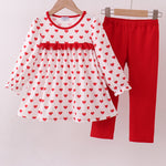 Adorable red heart print ruffle pants set that's pure joy from top to bottom! This charming two-piece features a sweet heart pattern in vibrant red tones, paired with playful ruffled details on the pants for extra flair. Perfect for little ones who love standing out with personality and style. The soft, comfortable fabric keeps them happy all day long, whether they're playing, exploring, or just being their fabulous selves. A delightful choice for anyone who believes fashion should be fun!