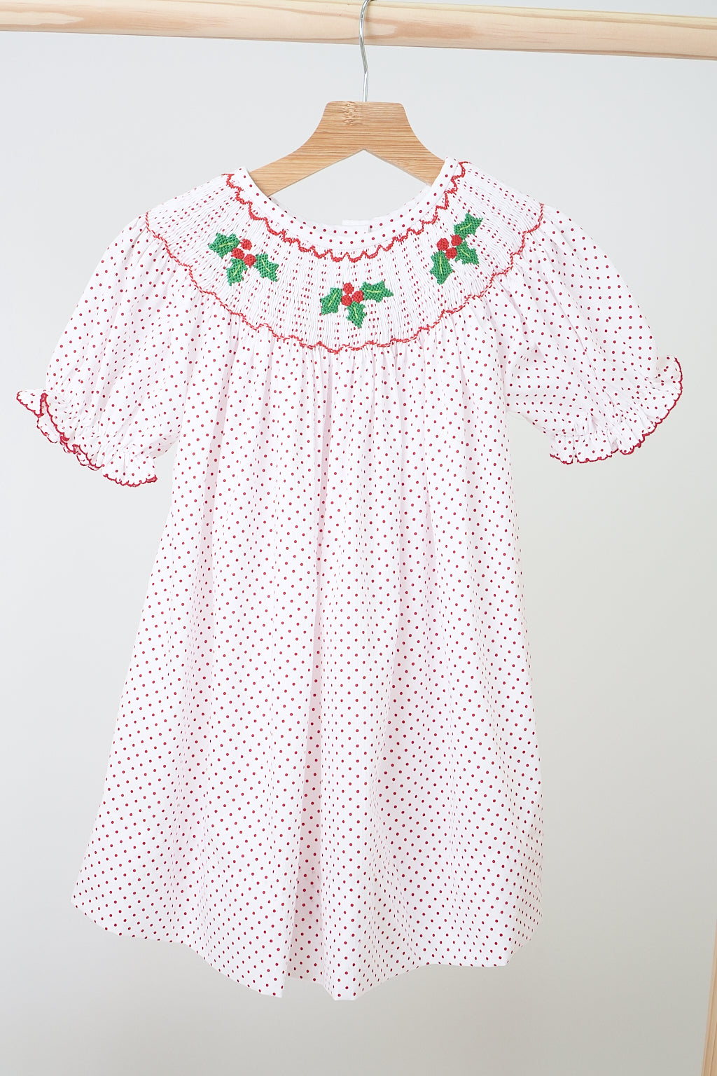 Pink christmas bishop hand smocked dot dress - 18M is backordered and will ship as soon as it is back in stock.